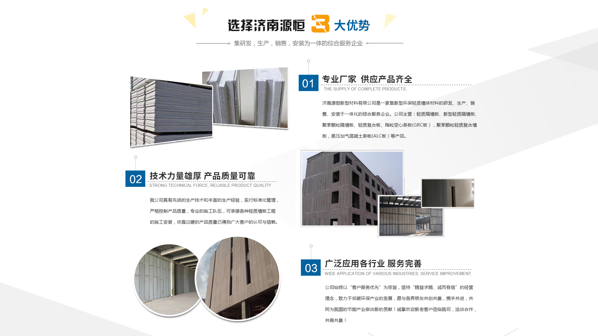 濟(jì)南源恒新型材料有限公司坐落于美麗的泉城濟(jì)南,是集新型環(huán)保輕質(zhì)墻體材料的研發(fā)、生產(chǎn)、銷售、安裝于一體化的綜合服務(wù)企業(yè)。我公司具有的生產(chǎn)技術(shù)和豐富的生產(chǎn)經(jīng)驗(yàn),為您提供輕質(zhì)隔墻板、新型輕質(zhì)隔墻板、聚苯顆粒隔墻板、輕質(zhì)復(fù)合板、陶粒空心條板(GRC板),聚苯顆粒輕質(zhì)復(fù)合墻板,蒸壓加氣混凝土條板(ALC板)等產(chǎn)品,本公司有專的施工隊(duì)伍,可承接各種輕質(zhì)墻板工程的施工安裝。輕質(zhì)隔墻板是國家推廣使用的新型輕質(zhì)、綠色無害建材,是墻改節(jié)能政策大力扶持的環(huán)保節(jié)能產(chǎn)品,是發(fā)達(dá)國家普遍采用的新型墻體材料。濟(jì)南源恒新型材料有限公司實(shí)行標(biāo)準(zhǔn)化管理,嚴(yán)格控制產(chǎn)品質(zhì)量,依靠過硬的產(chǎn)品質(zhì)量已得到廣大客戶的認(rèn)可與信賴。公司產(chǎn)品遍布各大城市,與國內(nèi)多家客戶建立了良好的合作關(guān)系。公司始終以“客戶服務(wù)優(yōu)先”為宗旨,堅(jiān)持“精益求精、誠而有信”的經(jīng)營理念,致力于低碳環(huán)保產(chǎn)業(yè)的發(fā)展,愿與各界朋友共創(chuàng)共贏,攜手共進(jìn),共同為我國的節(jié)能產(chǎn)業(yè)做出新的...